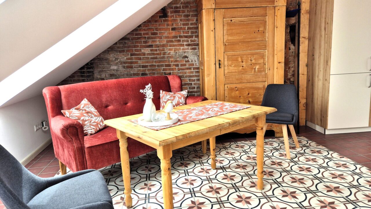 Die Ferienwohnung unterm Dach ist mit seinen Dachschrägen und der geschmackvollen Einrichtung besonders gemütlich. Sie hat 2 Schlafzimmer und eine Schlafcouch, Wohnzimmer/Küche, Bad mit Dusche/WC und ist gelegen im Fehnhaus Holthusen in Weener-Holthusen.